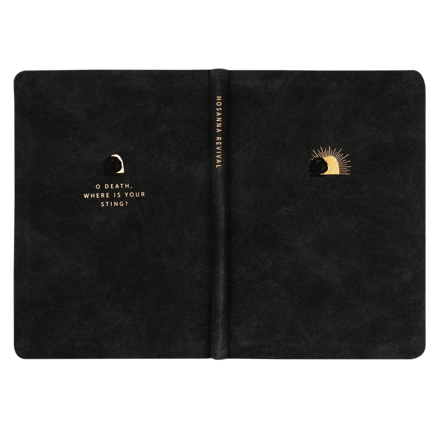 This black leather-like notebook is based on the beloved city of Jerusalem in Israel, where history unfolds in the Old and New Testaments and where the last week of Jesus's life was spent. May we never forget the unashamed, powerful ministry that took place in the city that saw Jesus's arrest, trial, crucifixion, entombment, and resurrection. A gold-foiled design of Jesus’s open tomb is placed on the cover of this notebook, symbolizing his victory over death, defeating every act of evil that has ever been and will ever be. The back of this notebook features the powerful verse from 1 Corinthians 15:55, “O Death, where is your sting?” This verse continues to echo in our hearts because of the cross and resurrection!