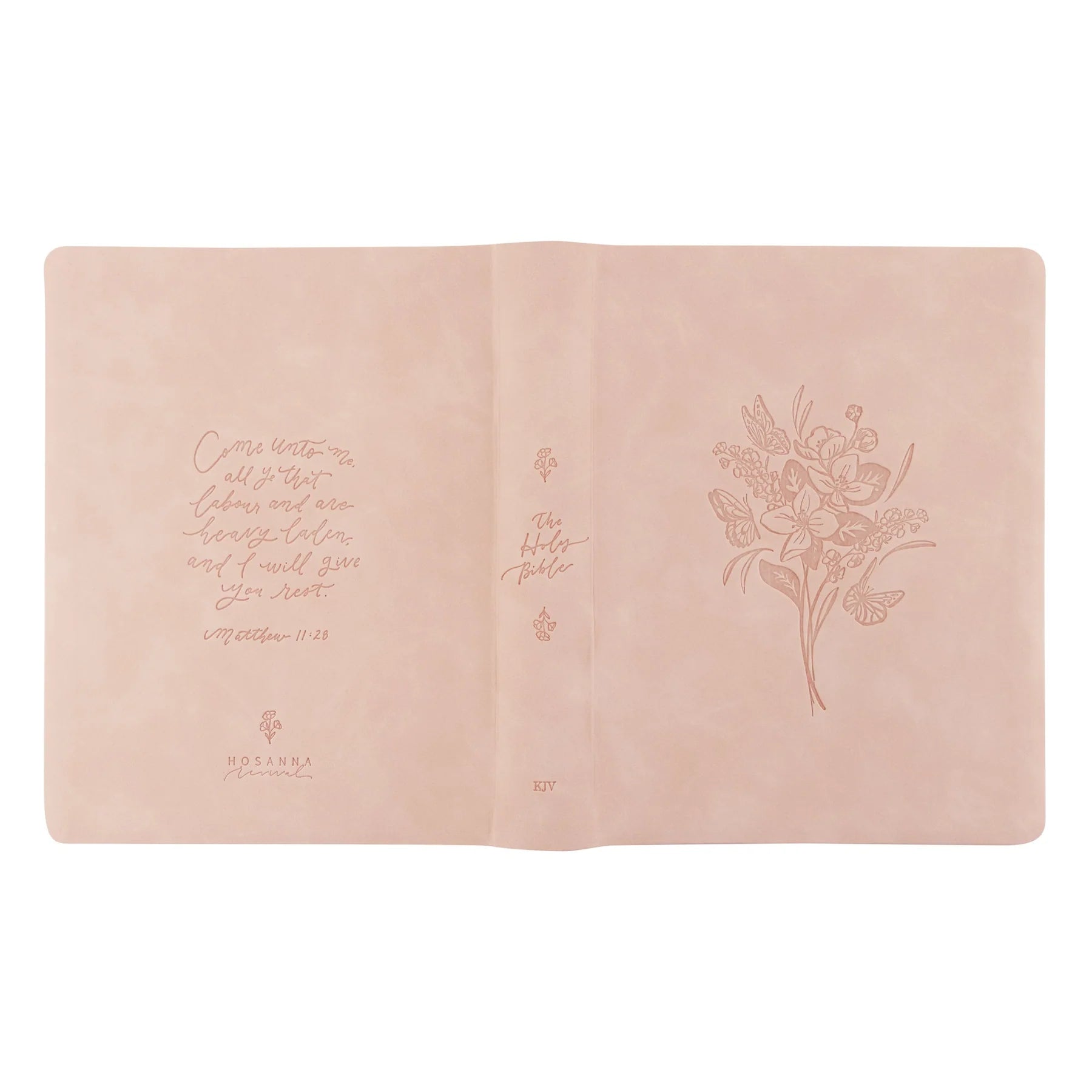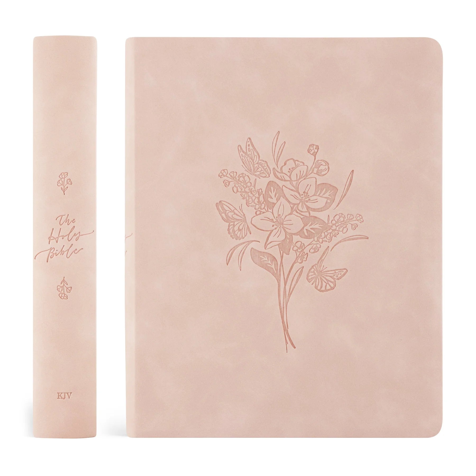 We’ve made our best-selling Shiloh design into a beautiful KJV Bible! Our soft and delicate suede Shiloh Bible is inspired by the town of Shiloh in the state of Georgia, where the neighboring Callaway Gardens house the beautiful Cecil B. Day Butterfly Center. In the same way that butterflies undergo an intricate transformation to reach their full beauty, we pray this Bible works in your heart to transform you from the inside out. The back features this beautiful verse from Matthew 11:28: “Come unto me, all ye that labor and are heavy laden, and I will give you rest.” We pray that as you dive deeper into your faith with the Lord, you will experience the peace and rest that he brings as he takes care of you!